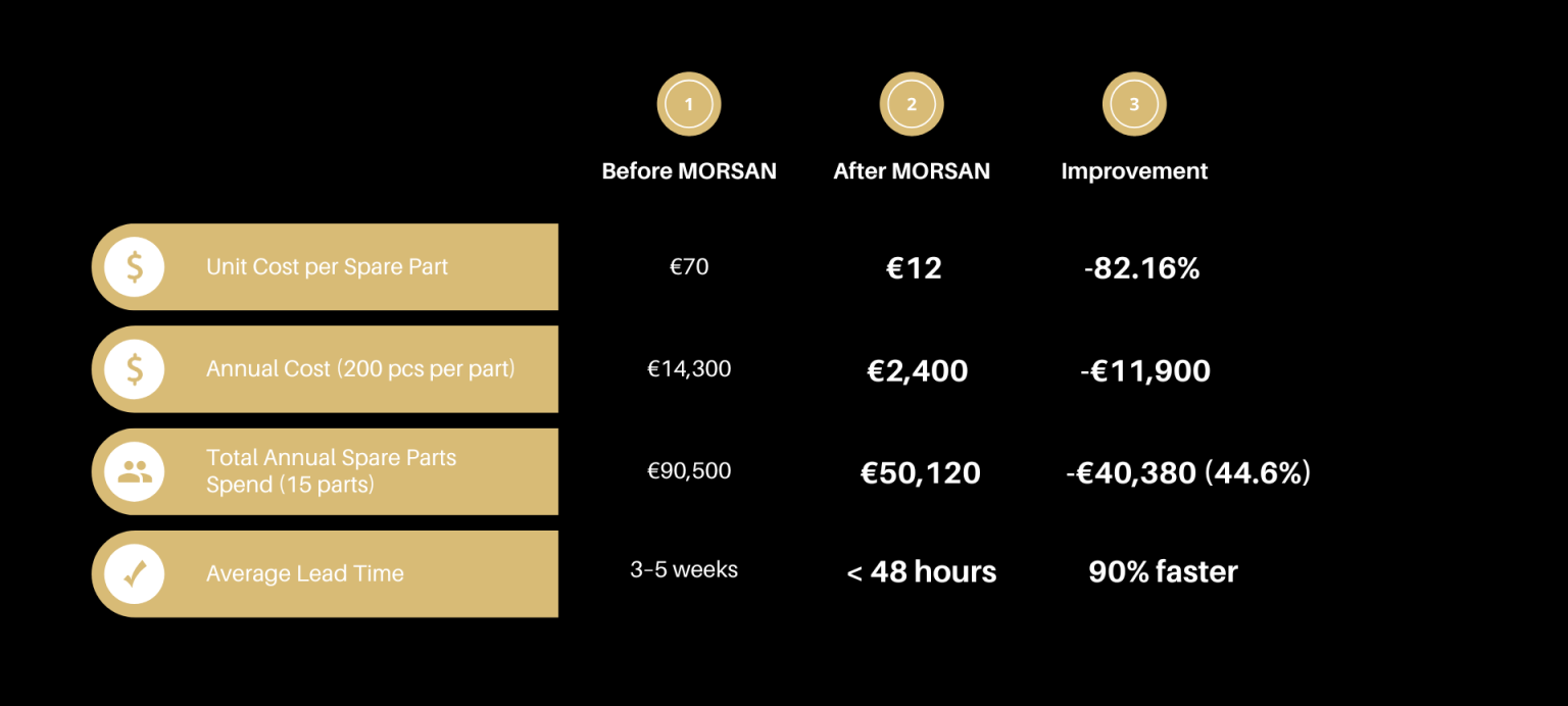 MORSAN introduced a digital spare parts program using advanced additive manufacturing techniques and engineering-grade polymers. The transformation included: